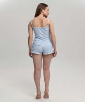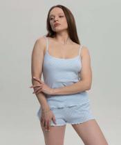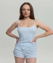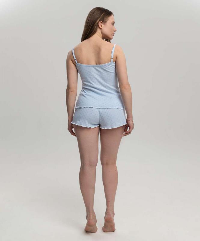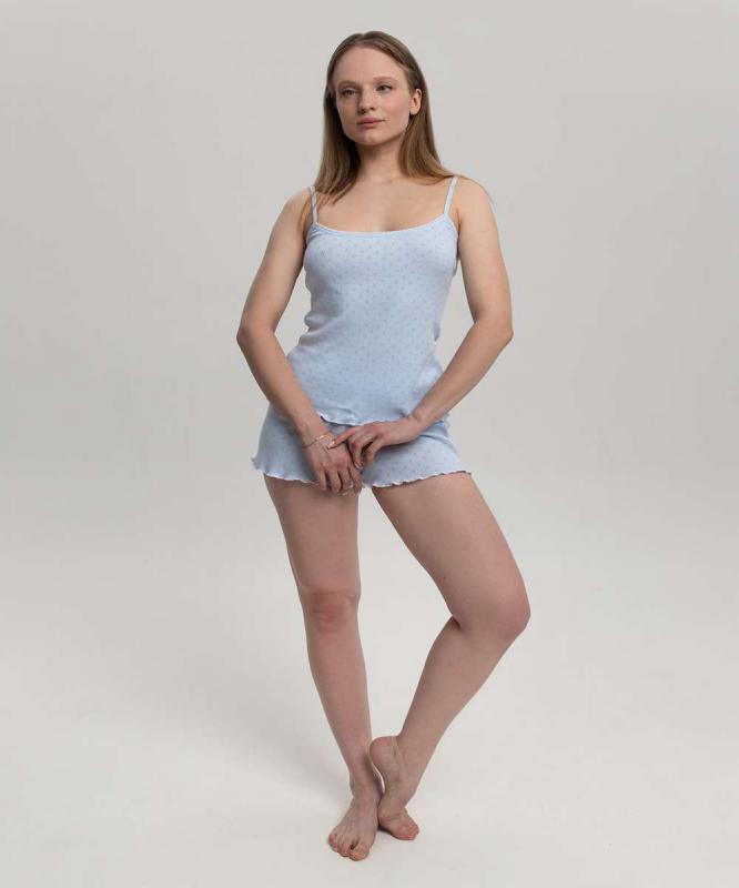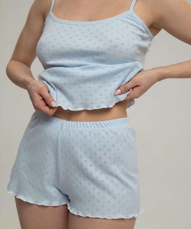 Удобная и милая пижамка из майки на регулируемых бретельках и коротких шортиков. Комплект выполнен из экологически чистого хлопкового полотна специальной эластичной вязки с ажурным рисунком (тип ткани рибана, 100% хлопок). Изделие безупречно садится по фигуре, обработка срезов на краеобметочной машине придает пижаме милый образ. Полочка и спинка отделаны ажурной резинкой, которая не только украшает топ, но и сохраняет от растяжения. Мягкая, удобная, практичная!