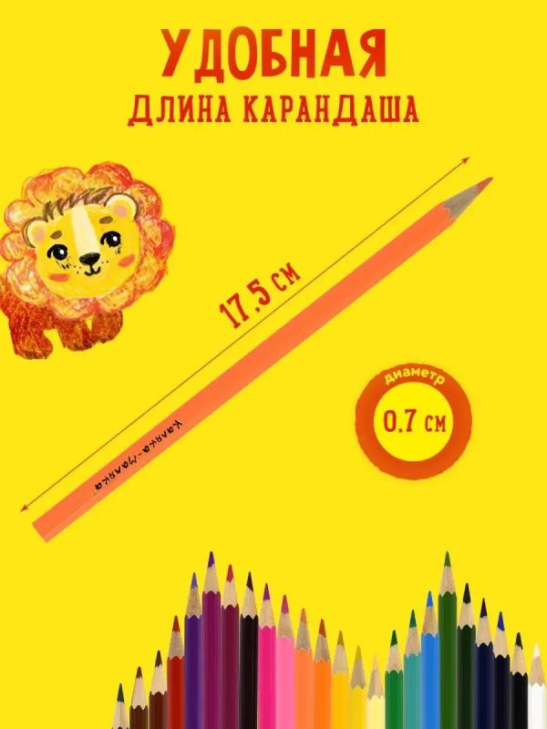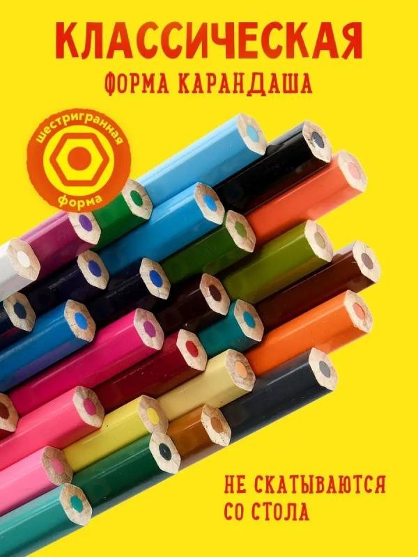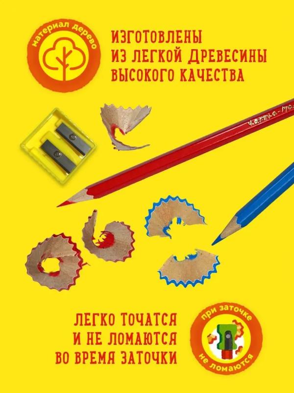 Карандаши цветные набор 6 цветов Каляка-Маляка имеют утолщенный ударостойкий грифель 3 мм повышенной мягкости и яркости. Детские мягкие цветные карандаши для рисования приятно наносятся на бумагу - однородно и равномерно, ярко и насыщенно. Разноцветные карандаши для детей изготовлены из древесины - липы высокого качества, они абсолютно безопасны. Яркие цветные карандаши с мягким грифелем при заточке не крошатся и не ломаются. Карандаши подходят для юных художников - без усилий легко ложатся на бумагу, оставляя яркий цвет, устойчивый к выцветанию. Шестигранные деревянные карандаши не скатываются со стола. Цветные карандаши для детского творчества приятно держать в руках - они покрыты лаком, защищающим корпус от высыхания. Художественные цветные карандаши для малышей позволят ребенку проявить свои способности и полюбить рисование!