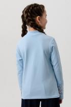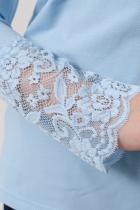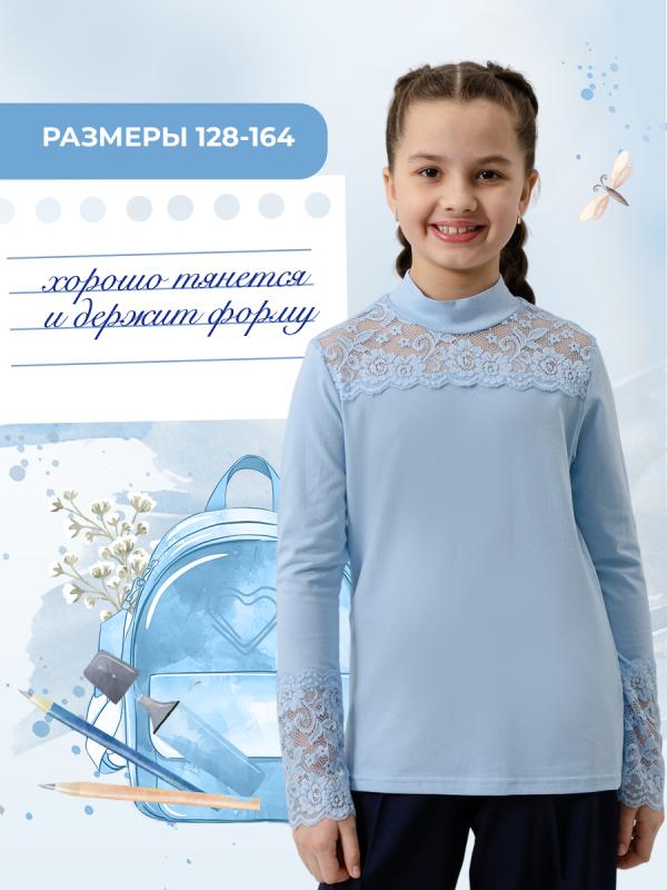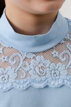 Блузка для девочек младшего и старшего школьного возраста, из трикотажного полотна – однотонная кулирка с лайкрой и кружева (дизайн и ширина кружева может меняться). Блузка прилегающего силуэта, с втачным рукавом, с воротником – стойкой. Спереди отрезная кокетка из кружева. На спинке отсутствуют линии членения. Рукав длинный одношовный. По низу рукава настрочено широкое кружево. Низ изделия подогнут.